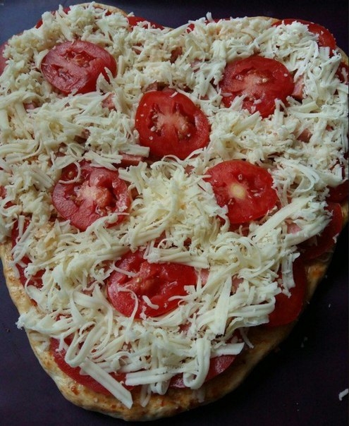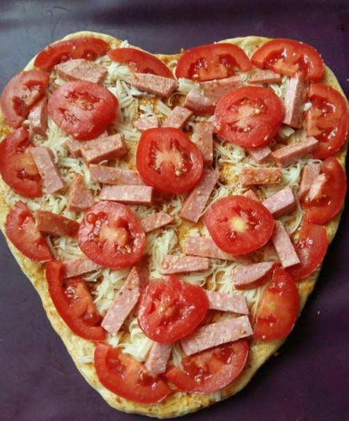 Можно заменить кетчупом, кому как нравится.Посыпать сверху, натертым на мелкой терке сыром моцарелла. Также можно заменить своим любимым сыром. Выложить нарезанную на брусочки колбасу. Затем выложить по всему краю помидор, нарезанный дольками. По центру выложить кружками.И вновь выложить слой сыра, не закрывая центральные помидоры. Затем немного лука полукольцами. (Забыла сфотографировать).