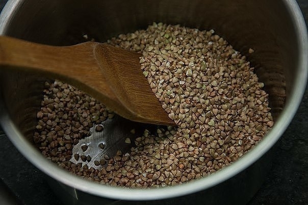 4. Зеленую гречку слегка обжариваем на растительном масле, затем добавляем воду и варим до готовности.
