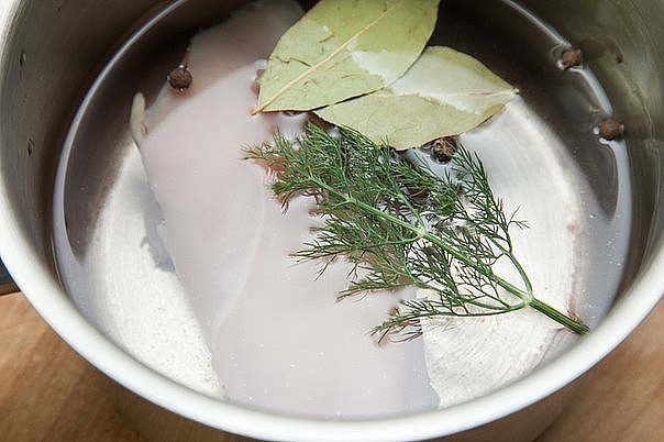 2. Куриную грудку промываем, заливаем водой, добавляем зелень и лавровый лист. Варим бульон.