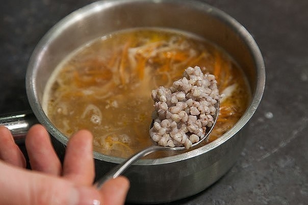 7. Обжариваем все на растительном масле, добавляем в бульон. Отправляем туда гречку и лапшу. Варим минут 10, затем добавляем рубленую зелень и снимаем с огня. Суп с зеленой гречкой готов.