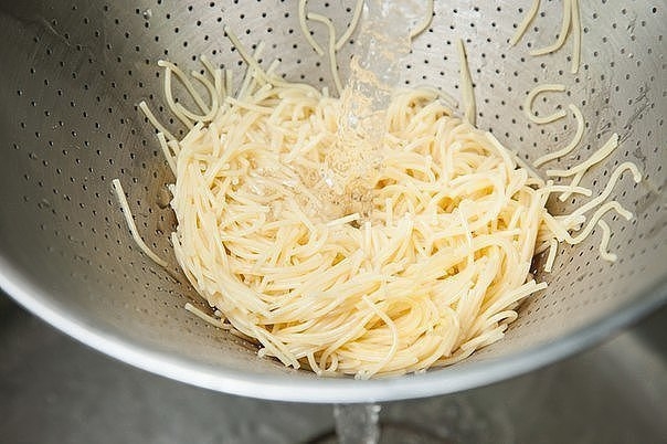 3. Лапшу отвариваем, промываем холодной водой и откидываем на дуршлаг.