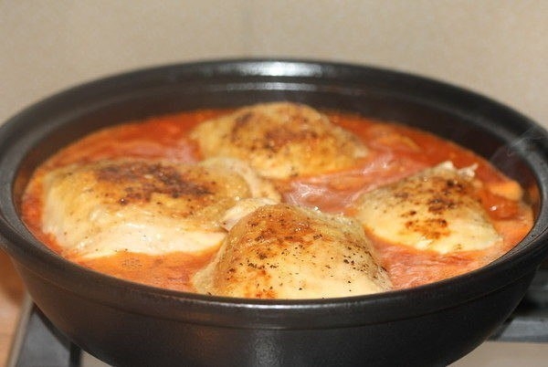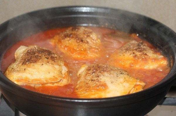 Выкладываем в ароматный томатный соус подготовленные куриные бедра и тушим накрытыми на медленном огне 40 минут.