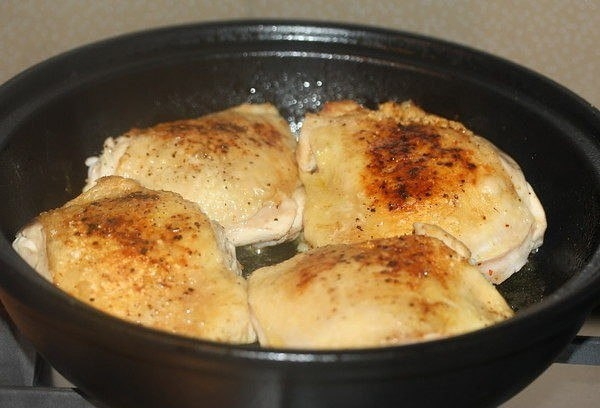 Куриные бедра промываем, посыпаем солью, перцем, тимьяном (можно добавить немного перца чили), выкладываем в горячее масло и обжариваем быстро с 2-х сторон. Выкладываем на тарелку.