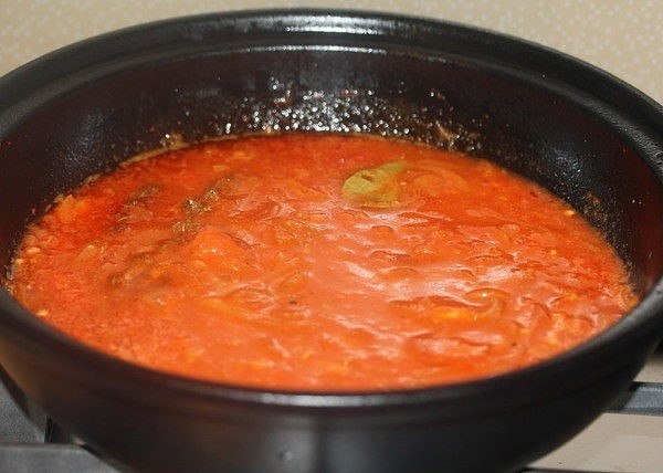 Вливаем в обжаренный лук с томатной пастой 150 мл. воды, добавляем лавровый лист, соль и молотый перец.