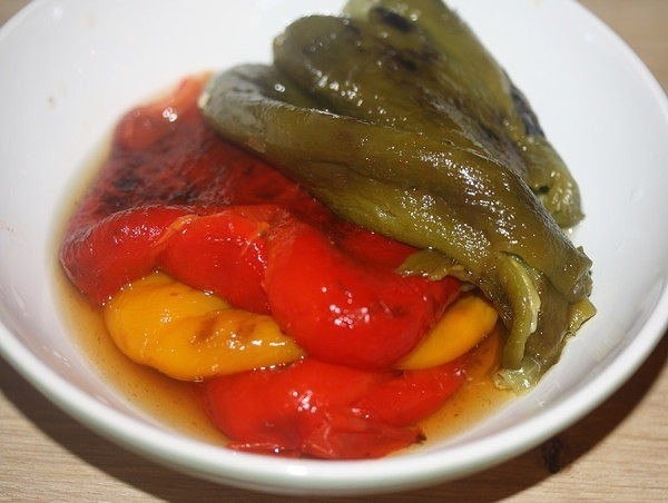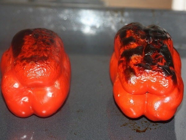 Чистые целые перцы выкладываем на противень и отправляем в разогретую духовку до 200 градусов, пока перцы не поджарятся. Затем переворачиваем и запекаем с другой стороны, перцы могут немного подгореть. Общее время около 10 минут. Выкладываем запеченные перцы в миску и накрываем ещё на 10 минут, затем легко снимаем кожицу.