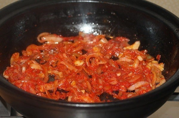 В масле после курицы обжариваем нарезанный лук до золотистого цвета, добавляем измельченный чеснок и жарим 15 секунд. Добавляем томатную пасту и жарим 2 минуты.