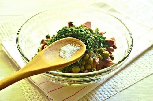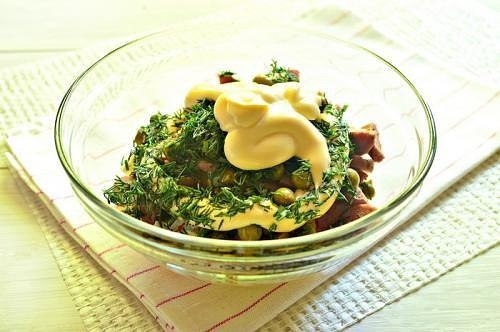 Состав нашего салата разнообразим консервированным зеленым горошком, предварительно слив с бобового жидкость.