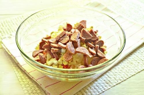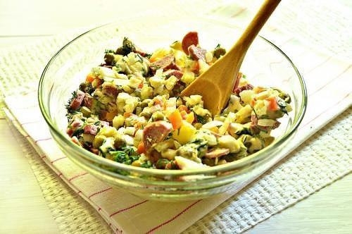 Сегодня в нашем меню салат, который станет украшением любого праздничного застолья. Да, и для обыденного меню такой салат подойдет, ведь ингредиентами такого блюда являются простыми и доступными. Пикантный вкус такому салату придают охотничьи колбаски и сырный соус, которым блюдо заправляется. По внешнему виду и по рецептуре салат чем-то напоминает полярный «зимний» салат.