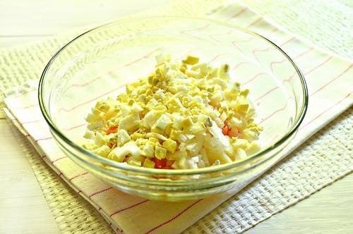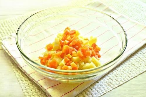 Для предлагаемого салата отварите следующие ингредиенты: картофельные клубни, морковь, куриные яйца. Картофель отвариваем в «мундире». Воду, в которой будут вариться продукты, присолите. Отварные картофельные клубни, морковь и яйца остудите. С овощей удалите кожурку, а яйца очистите от скорлупы. Подготавливаем чашу (миску, плашку), в которой будем соединять компоненты салата. Начинаем с картофельных клубней. Нарезаем их в форме небольших по размеру кубиков. Перекладываем картофельные кубики в чашу.