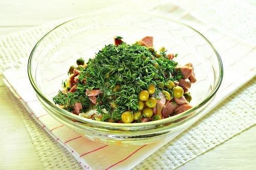 Добавляем в будущий салат порубленный свежий укроп (его можно заменить другой свежей зеленью: петрушкой, зеленым луком).