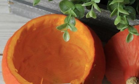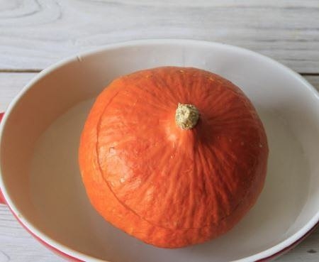 Тыкву нужно будет промыть под проточной водой и обсушить. Срезать верхушку тыквы, это будет крышка нашей тыквенной кастрюли. Удалить семена и мякоть тыквы. Мякоть можно использовать для приготовления любого другого блюда.