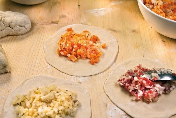 Дальше просто, если прибегнуть к одному из распространенных способов лепки манты: на сочни для среднего размера манты уложим по столовой ложке (или чуть больше) той или иной начинки...