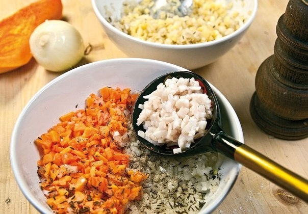 Похожие манипуляции проделаем и с тыквенной начинкой, измельчив мякоть тыквы и добавив в начинку равную долю лука, а также соль, свежемолотый перец и зиру. Тыквенная начинка по классике делается с добавлением хорошо измельченного курдючного сала, которое, конечно, при необходимости можно заменить таким же количеством растопленного сливочного масла. Разумеется и эту следует хорошо размешать.