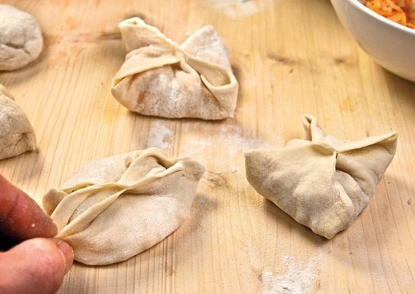 Теперь нужно только защипнуть нижние концы тючка, обращая внимание на то, чтобы это были концы верхнего защипа теста: сначала с одной стороны заготовки, затем - с другой (иначе форма у манты будет причудливой). Полуфабрикат манты готов, особенно если его чуть прижать ладонями с боков, чтобы заготовка приняла продолговатую форму. Важно только при этом помнить, что манты не нуждаются в прочных швах, как на варениках или на пельменях.