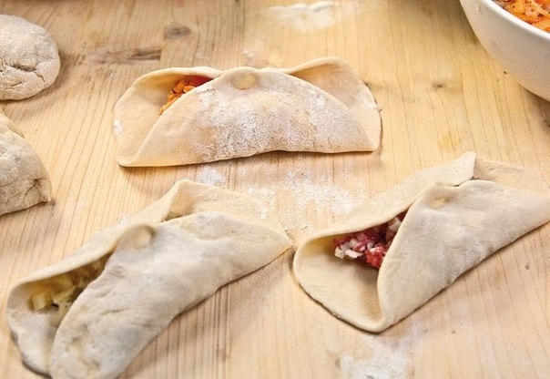 ...затем непосредственно над начинкой в один защип сначала слепим два противоположных конца сочня...