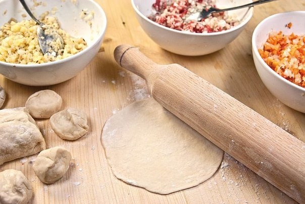 Если же манты делаются без помощников, то лучше действовать последовательно - с каждой частью теста по отдельности. А именно: разделить эту часть на то количество "грецких орехов" для манты на один ярус пароварки и раскатать каждый кусочек в сочень величиной примерно с чайное блюдце. Но так раскатать, чтобы сочень был тонким. Или, скажем так, относительно тонким, чтобы его не порвала начинка.