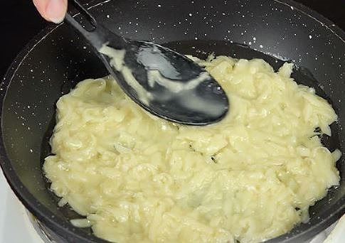 Выкладываем картофельное тесто на дно сковороды, распределяем ложкой, чтоб получился "блинчик".