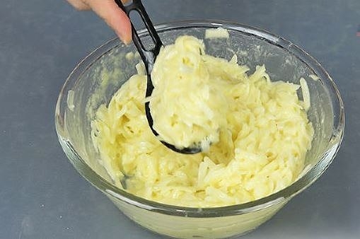 Готовим картофельное "тесто". Для этого картофель чистим, натираем на терке, солим. Оставляем на пару минут. Затем отжимаем сок. Добавляем яйца и муку. Перемешиваем.