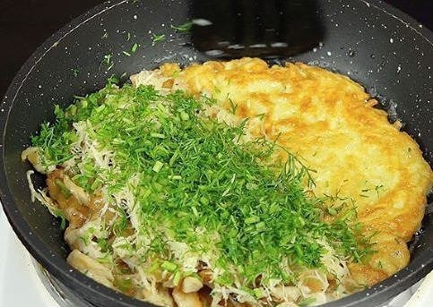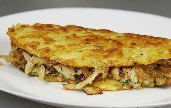 Когда картофельный блинчик подрумянился - переворачиваем его. На половину блинчика выкладываем начинку - обжаренную курицу с луком, сыр и нарезанную зелень.