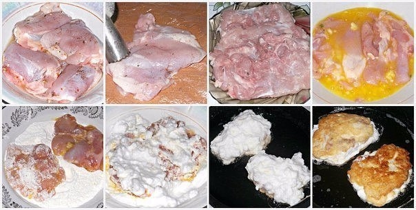 А теперь укутываем их в белковое "одеяло", помогая при этом рукой.В разогретое масло выкладываем отбивные и жарим с двух сторон до румяной корочки — на это уйдёт примерно по 5 минут с каждой стороны.Куриные отбивные в воздушном "одеяле" готовы. Подаём их в горячем виде со свежими овощами, зеленью и по желанию гарниром. Приятного аппетита!