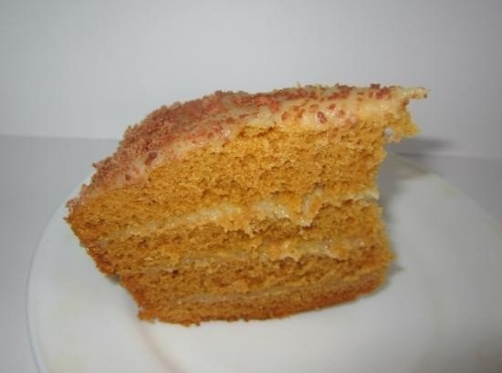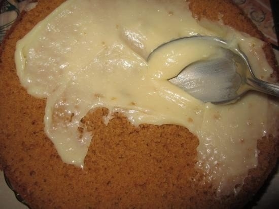 Готовый корж делим на четыре части и каждую смазываем молочным кремом.