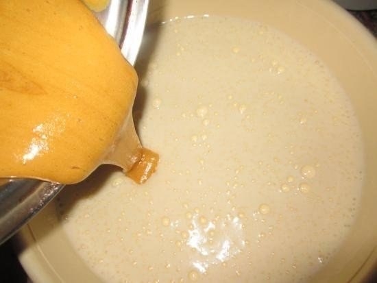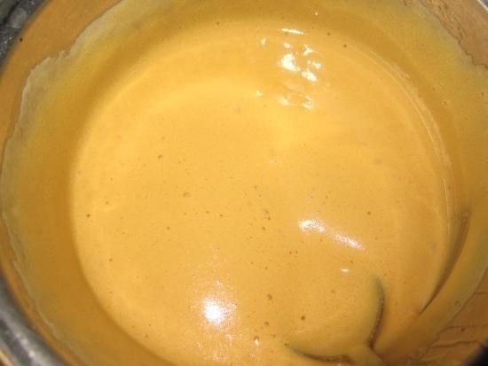 Для начала в мед добавляем соду, перемешиваем. Ставим готовую массу огонь, все время помешиваем. Масса должна увеличится в размере и потемнеть до карамельного цвета.