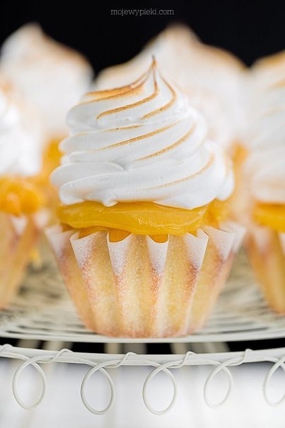 Остывшие кексы смазать лимонным курдом. Итальянское безе сразу после приготовления поместить в кондитерский мешок и украсить им кексы.
