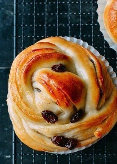 3. Переложить тесто на рабочую поверхность, припыленную мукой, и нарезать на 12 равных частей. Раскатать каждый кусок в прямоугольник приблизительно 20 на 10 см. Посыпать корицей, изюмом и сахаром. Скатать в ролл. Каждый ролл разрезать пополам, не дорезая до конца с одной стороны. Переплести концы жгутиком. Жгутики сложить розочкой и выложить на подготовленный противень. Накрыть булочки кухонным полотенцем и дать подняться в течение часа.
