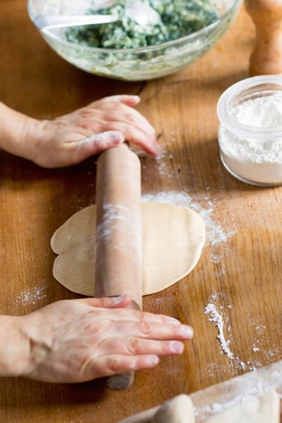 1. Приготовить тесто. В глубокую миску муку просеять со щепоткой соли и перемешать с 3 ст. л. оливкового масла. Вливая тонкой струйкой воду, вымешивать до получения