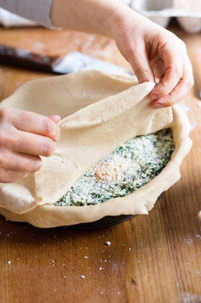 Изделие присыпать оставшимся пармезаном и сливочным маслом и накрыть меньшими пластами теста, промазывая их оливковым маслом. Свисающие края изделия приподнять, завернуть друг на друга и плотно защипать.