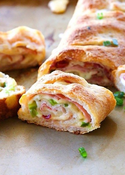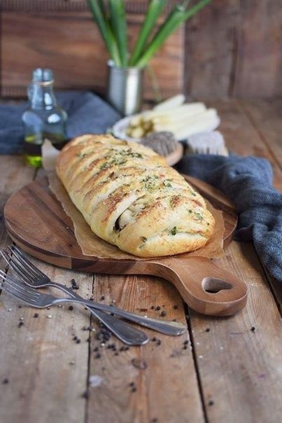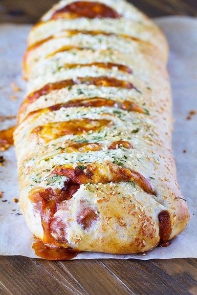 5. Смазать поверхность рулета яйцом, посыпать оставшимся сыром, сделать на рулете поперечные разрезы через 4–5 см. Последний штрих — это или петрушка, или орегано. Выпекается стромболи в духовке при температуре 250–240°C в течение 10–12 минут. Приятного аппетита!