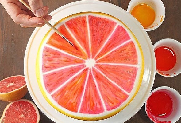 8. Смешайте в миске желтый, оранжевый, розовый и цвета слоновой кости красители (по 2 капли) с ложкой воды. Покройте большой кистью боковые стороны «грейпфрута».