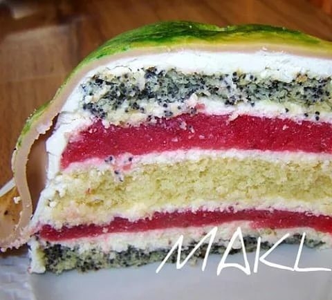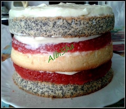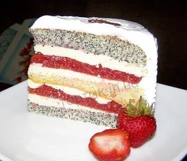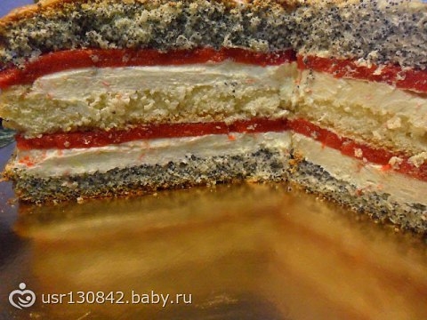 Маковый корж - крем - желе - крем - белый корж - крем - желе - крем - маковый корж - крем.