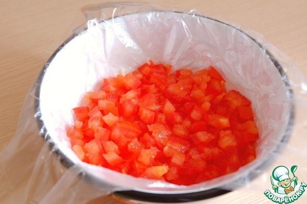 Помидор разрезать на две части, удалить лишнюю влагу и семена. Помидорные чашечки порезать мелкими кубиками