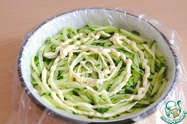 Выложить огуречную соломку. Смазать майонезом. Миску перевернуть на плоское блюдо
