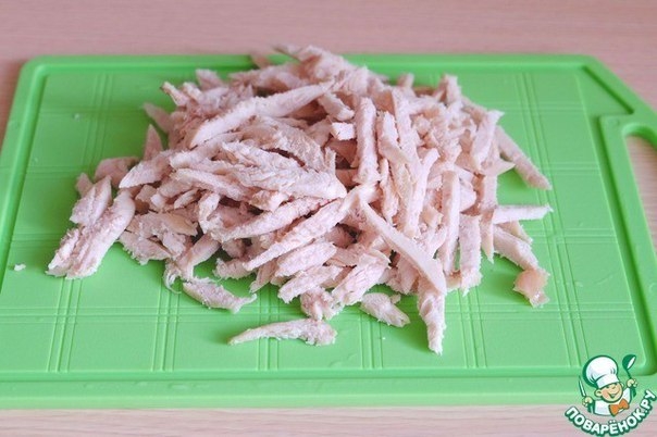 Куриное филе отварить в подсоленной воде, порезать не крупными брусочками