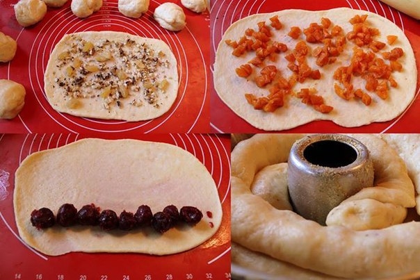 Затем разделить тесто на 9 равных частей. Раскатать тонко в прямоугольные пласты. Разложить начинку и свернуть в мини рулеты (см фото). Вишню я выложила в ряд по краю и завернула.