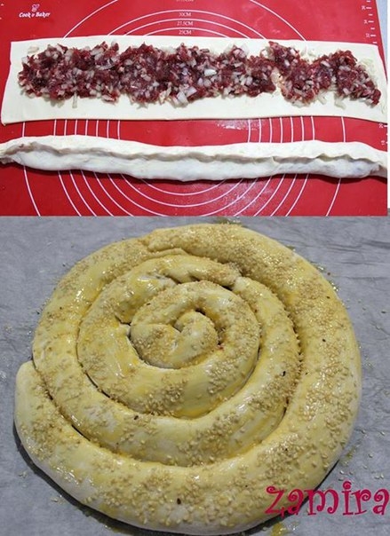 Раскатать тесто. Разрезать на 3 длинные полоски (см фото). Выложить фарш. Защипать края. Выложить спиралью и швом вниз в форме улитки на противень.