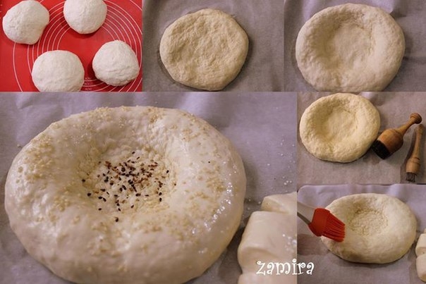 Затем смазать поверхность молоком, посыпать по желанию седана и кунжут и печь в заранее разогретой до 200 гр духовке примерно 10 минут. Горячую лепешку для блеска слегка смазать молоком.