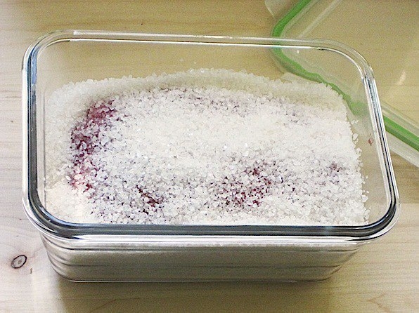 Теперь берем любою посуду, которую потом можно будет плотно закрыть, и высыпаем на ее дно половину соли (250 грамм), на соль кладем мясо и засыпаем его оставшейся солью, закрываем контейнер и ставим его на день в холодильник. Через сутки мясо промываем и опять высушиваем салфеткой, соль из контейнера высыпаем и снова на сутки закрываем в нем телятину.