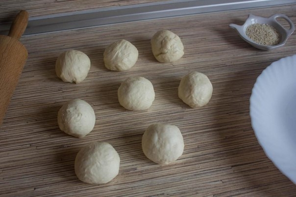 9. Подошедшее тесто обомните и поделите на 8 равных частей по 65 г каждая с помощью весов или на глаз.Каждый кусочек теста скатайте в гладкий шарик, накройте пищевой пленкой и оставьте отдохнуть еще на 15 минут, так тесто легче будет раскатывать.