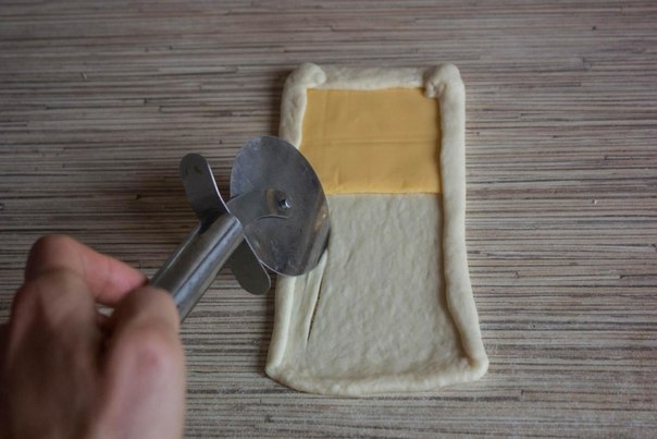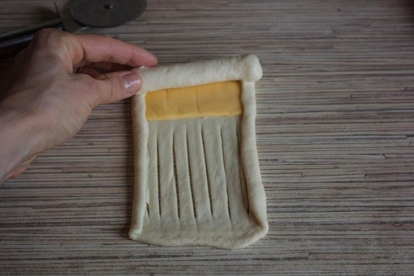10. Раскатайте каждый кусочек теста в прямоугольник шириной чуть больше ширины упаковки сыра и в 2 раза длиннее. На раскатанное тесто положите пластину сыра.Края теста вокруг сыра подогните и разравняйте. Сделайте надрезы теста на свободном от сыра отрезке.