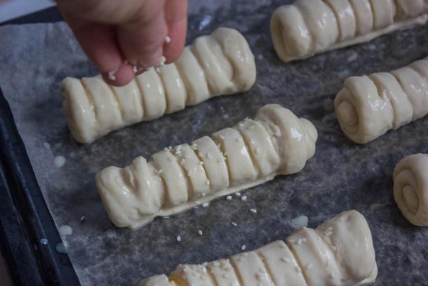 13. Посыпьте булочки кунжутом (он прилипнет к яичной смеси).