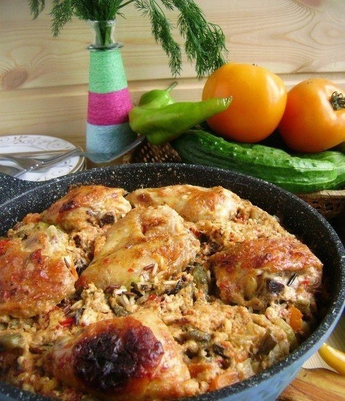Поставить в разогретую до 200 градусов духовку, через 10 минут убавить нагрев до 160, накрыть фольгой или крышкой и готовить до мягкости риса и впитывания жидкости. Если вдруг рис еще сырой, а жидкости уже нет, долить немного кипятку. Снять фольгу и подрумянить верх курицы.