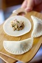 Поместить чайную ложку смеси на каждый лист теста, промазать края водой и защипать вилкой.