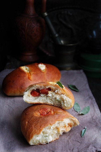 Присыпать миску мукой, положить в нее наш шар и убрать в теплое место для подъёма. Щедро посыпьте рабочую поверхность мукой, выложите тесто скребком липкой стороной верх, слегка присыпьте мукой тесто сверху. Разделите на три части. Теперь берем одну часть теста и пальчиками разминаем его в овал, выкладываем несколько помидорок черри, несколько ложек маскарпоне, кусочки чеснока. Свободные края нужно залепить, чтобы закрыть начинку. Теперь формируем хлеб, переворачиваем его швом вниз и придаем продолговатую форму батона.