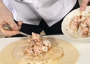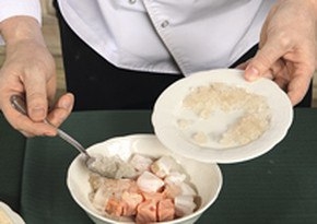 Приготовьте рыбную начинку. Рыбу опустите в кипящую соленую воду на 20– 30 секунд. Выньте и тут же охладите в воде со льдом. Обсушите на салфетке. Рыба внутри должна оставаться сырой. Для рыбной начинки соедините все составляющие и аккуратно перемешайте, чтобы кубики рыбы не поломались.