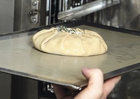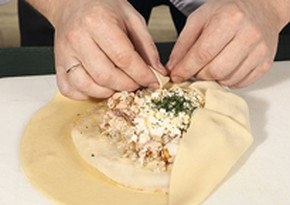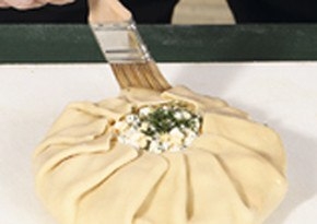 Края теста заверните к центру и защипните. Оставьте посередине небольшое отверстие.