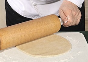 Дрожжевое (или слоеное) тесто раскатайте тонким слоем в виде круга диаметром 25–30 см.