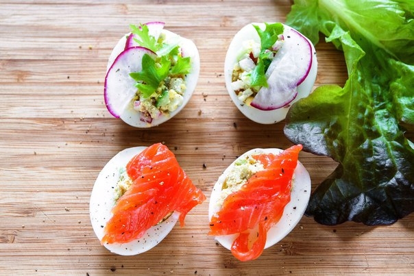 3. Положить начинку в половинки яйц, сверху положить по тонкому кусочку сёмги